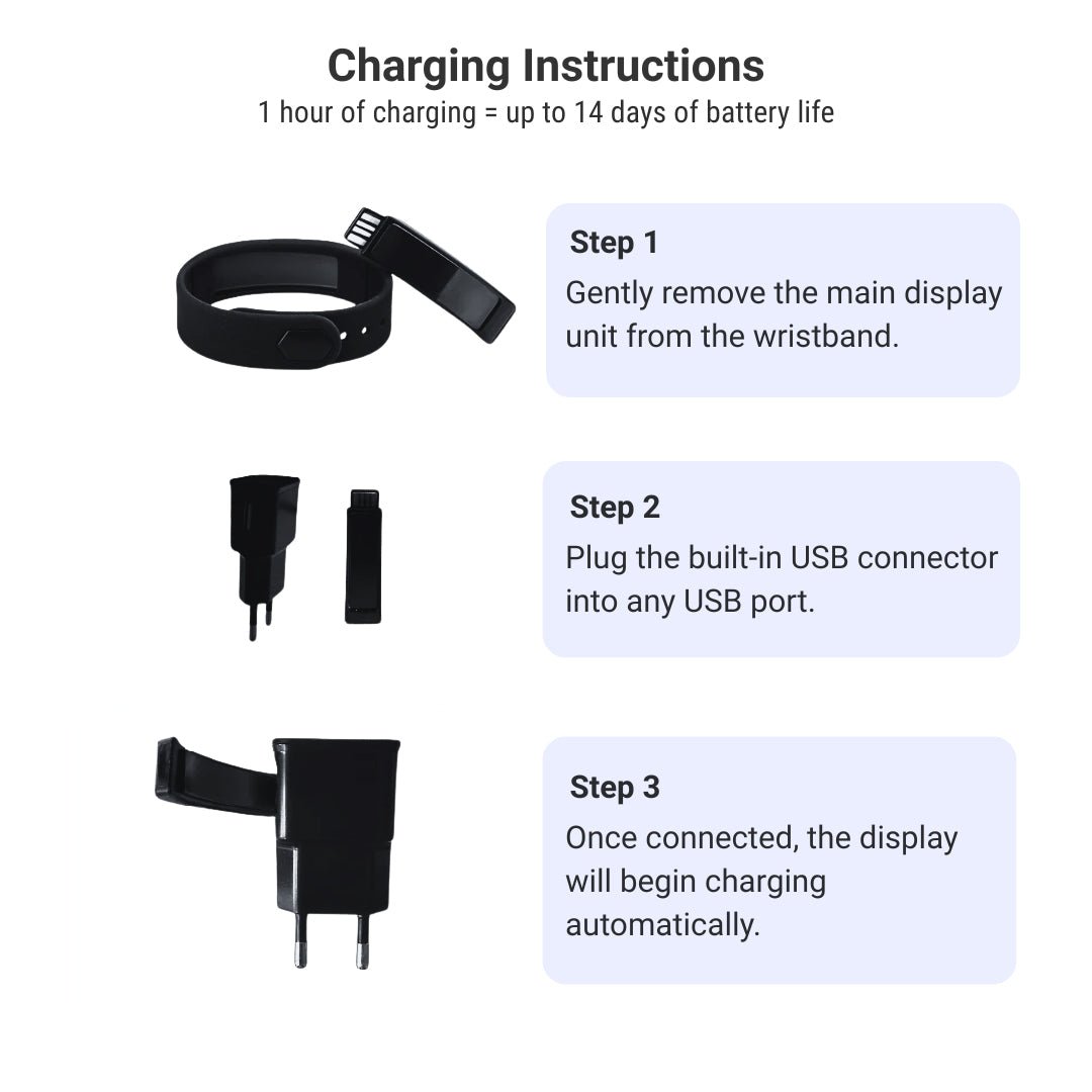 The battery lasts up to 14 days on a single charge, depending on use. Recharging is quick and simple with the included USB plug.